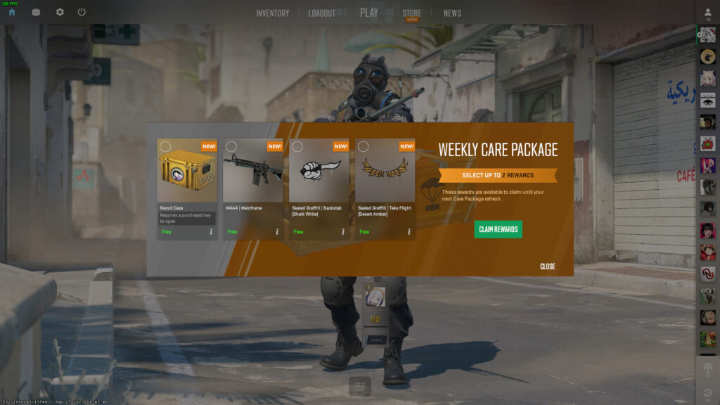 これまでドロップされるアイテムは完全ランダムで配布されていましたが、CS2ではWeekly Care Packageという新しいシステムによって、4枠の中からどのアイテムを取得するか選べるようになるようです。これまで通り、プライベートランクが上がったタイミングで週1回2個アイテムが貰えるようになっています。